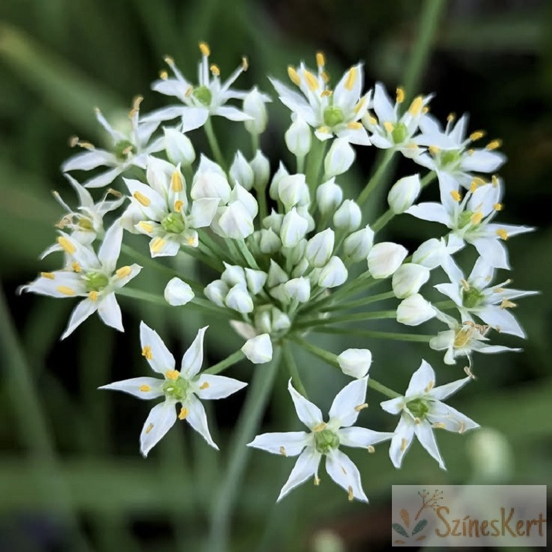 Virágai aprók, fehérek, csillag alakúak. Ehető fokhagymaízű leveleiért és fiatal virágzatáért ültetjük.