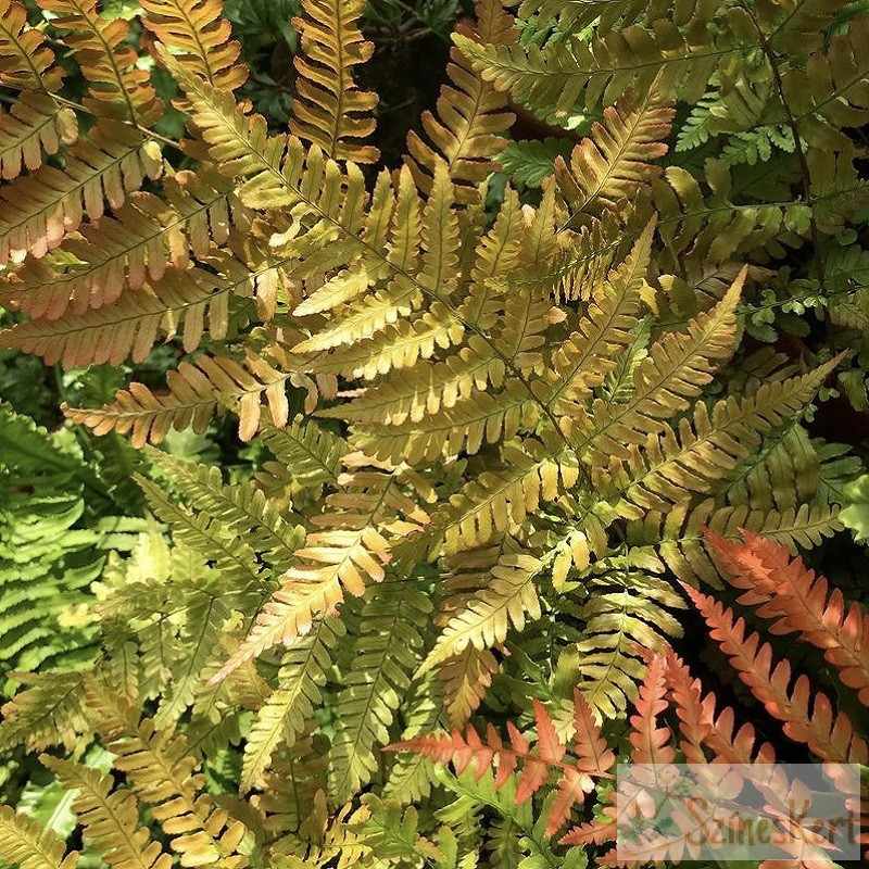 Dryopteris erythrosora - japán ernyőpáfrány egyedülálló abban a tekintetben, hogy az egyébként sötétzöld dús levelek között a frissen kihajtott levelek rézvörösek.