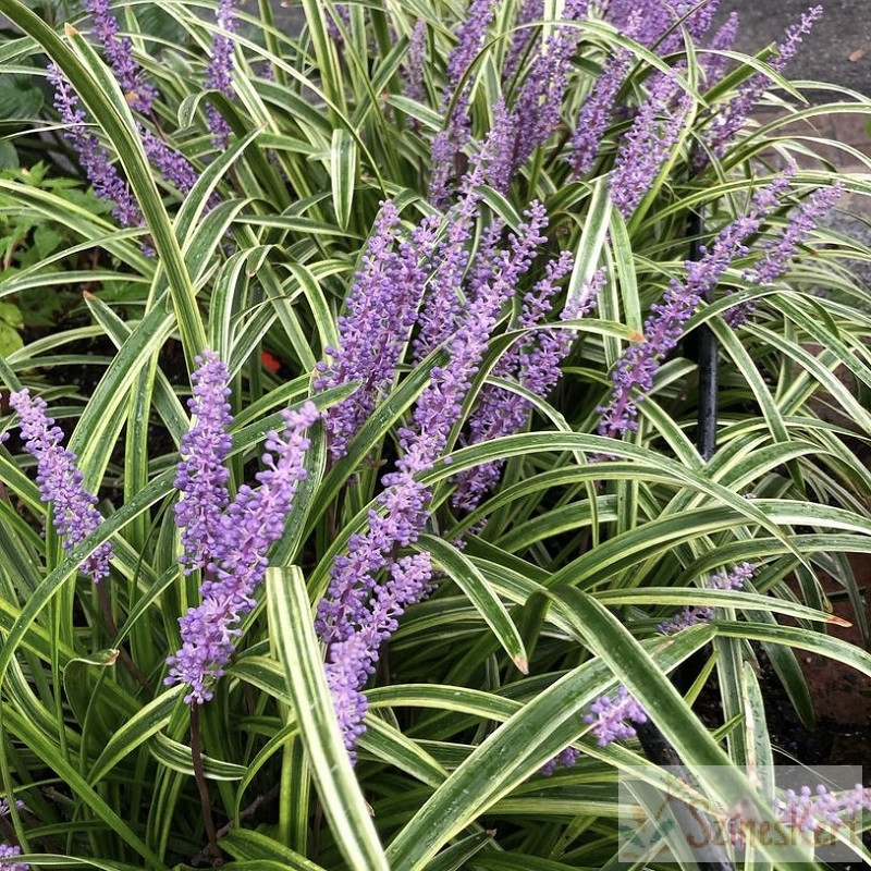 Liriope muscari 'Variegata' - gyöngyikés gyepliliom egy őszi virágzású fagytűrő gyökérgumós dísznövény, mely augusztus végétől hozza dekoratív lila fürtvirágzatát.