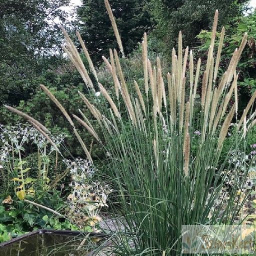 Virágait nyár végén hozza, magasan kiemelkedik a lomb fölé, a többi Pennisetum-tól jóval hosszabb, de keskenyebb bugái különleges díszek.