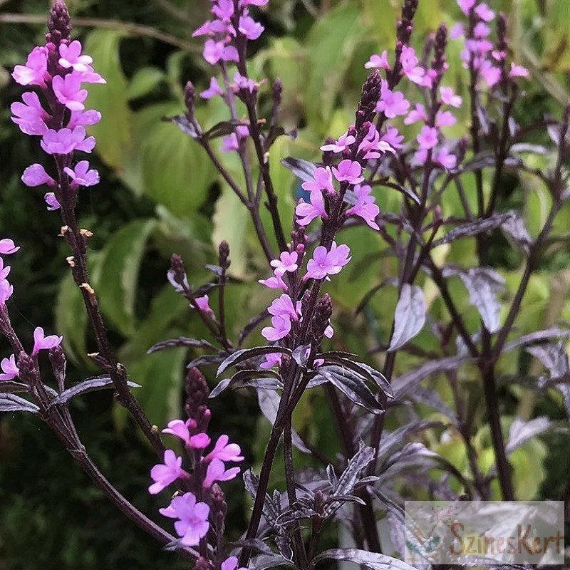 Verbena officinalis 'Bampton' - közönséges vasfű sötétlila szárával, sötét leveleivel és halványrózsaszín virágaival együtt egy gyönyörű kontrasztos évelővirág.